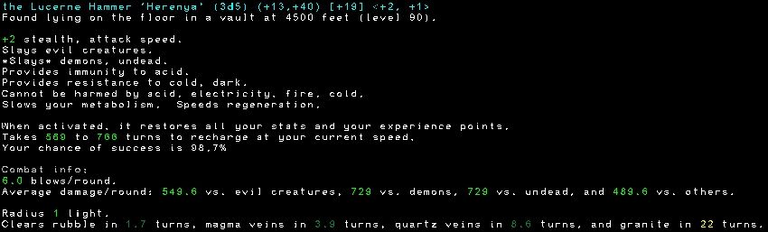 Code:the Ring of Estelon <+3, +1> Dropped by Maeglin, the Traitor of Gondolin at 4350 feet (level 87). +3 strength, intelligence, wisdom, dexterity, constitution, charisma, speed. Provides immunity to acid. Provides resistance to lightning, fire, cold, dark, sound. Provides protection from confusion. Cannot be harmed by acid, electricity, fire, cold. Speeds regeneration. Prevents paralysis. Grants telepathy. Grants the ability to see invisible things. When aimed, it creates a large frost ball with damage 200. Takes 254 to 312 turns to recharge at your current speed. Your chance of success is 90.7% Radius 1 light.Leave a comment: