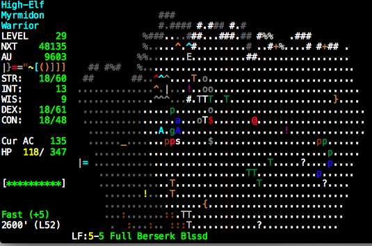 My current @ just picked up a wand of TO but it only has 5 charges left. We'll see. I'd like to crash dive again and survive to tell the tale. I find not being able to ID potions rather annoying. I just wing it and quaff them as I find them because I can't be bothered storing them at home and playing games keeping track of what potions might be what kinds of potions based on what depth I picked them up at. With careful notetaking I could avoid quaffing an UN ID'd potion and losing STR and gaining Wisdom.... But my background in gaming is DooM the original. Point and shoot and explore; real simple, straightforward gameplay. That's why I prefer warrior to spell casters or fragile/paranoid rangers. Also, Angband is long, and I don't have the patience for the bumbling around in the early game that takes some careful play with the more fragile classes. I can make quick progress with a Warrior.