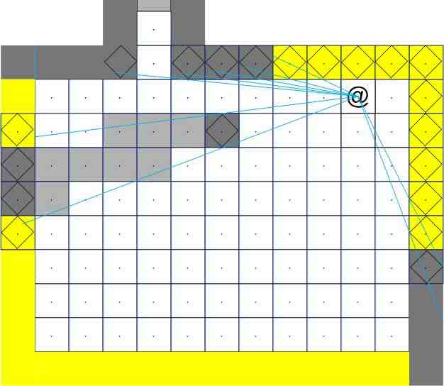 So maybe it's not the DFOV method (maybe it is?). But the above quote does describe my (adopted, maybe my own little hybrid) method. You can only see a tile, if you can see the center point of that tile, wall or not. When the nearer wall prevents you from seeing the center point of the further wall, then you stop seeing the wall. I seems to work well. Feel free to poke holes in it.