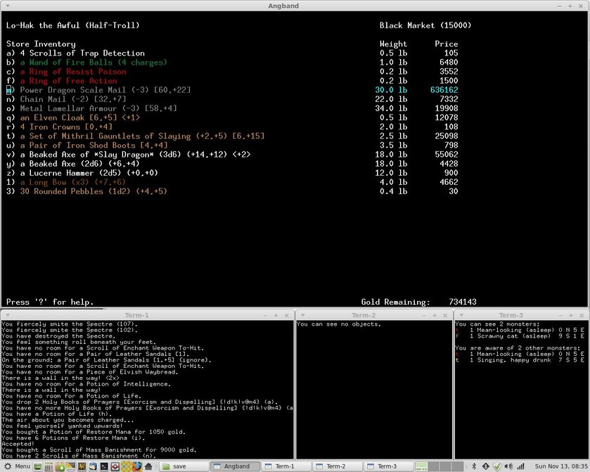 This Half-Troll Paladin is ROFLstomping his way to Sauron and Morgoth. At dlvl 4750', I recall to town to drop off the rods of speed and healing and check out the black market. Low and behold, there is PDSM!!! I can't recall ever seeing that - and I can afford it!! Unfortunately, I don't really need it as it doesn't cover my one resist hole (Nexus).
