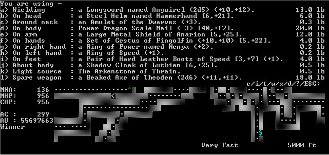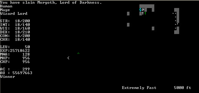 Congratulations on the win! I first started playing 2.7.8 way back in 1997, didn't win legitimately until 3.0.5 in about 2005. I've probably won with every version since but really struggling with the latest nightlies thanks to the monster upgrades - this is a good thing by the way! I feel the changes take the game back towards the difficulty of older versions (pre-3.0), but with much better features and UI.