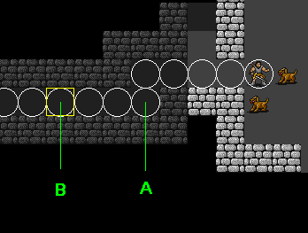 So by that method, the player would not be able to target point B either? Although there is a straight line to point B, the line passes through point A and there is not a straight line to point A. Therefore the projection would end in the tile directly above point A.
