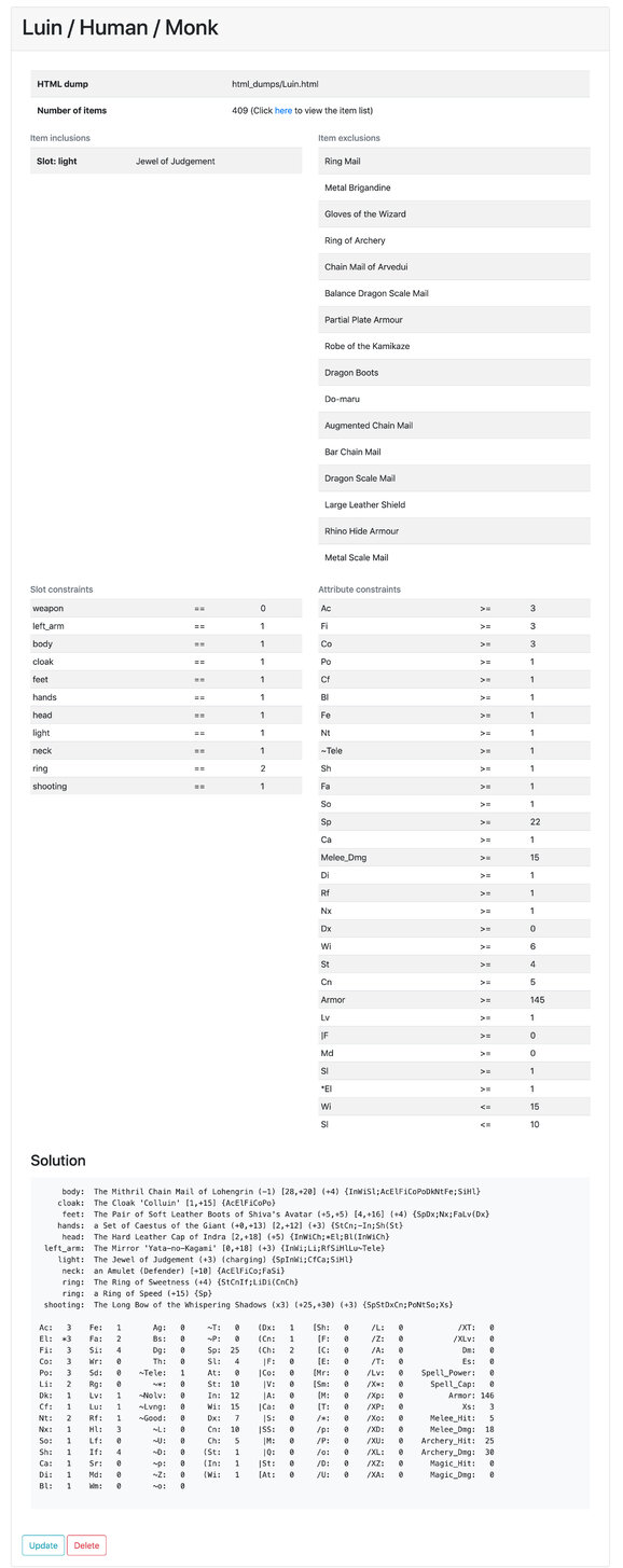 https://optimiser.riverwaterhill.com is a website that takes in a HTML character dump from frogcomposband and tries to figure out what combination of equipment your character should wear given a set of constraints set by you.